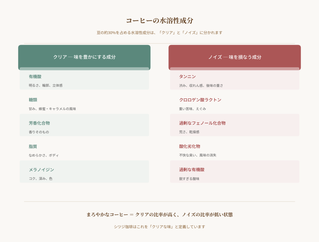 まろやかなコーヒーとは、クリア成分の比率が高く、ノイズ成分の比率が低い状態——私たちはこれを「クリアな味」と呼んでいます。