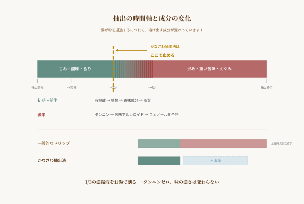 コーヒー抽出では、水溶性の高い成分から順に溶け出します。初期(〜30秒)に有機酸が、前半(30秒〜2分)に糖類や香味成分が、中盤(2〜4分)に脂質やメラノイジンが溶出します。そして後半(4分〜)になって、タンニン、苦味アルカロイド、フェノール化合物など、味を重く渋くする成分が出てきます。