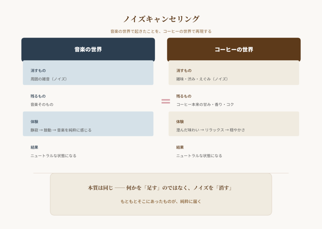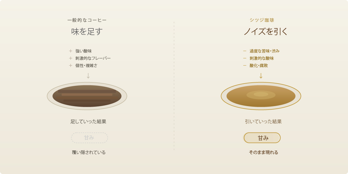 一般的なコーヒーでは、この「良い成分」と「ノイズ」が混在した状態でカップに届きます。甘みは確かにそこにあるのですが、ノイズに覆い隠されて感じにくくなっている。