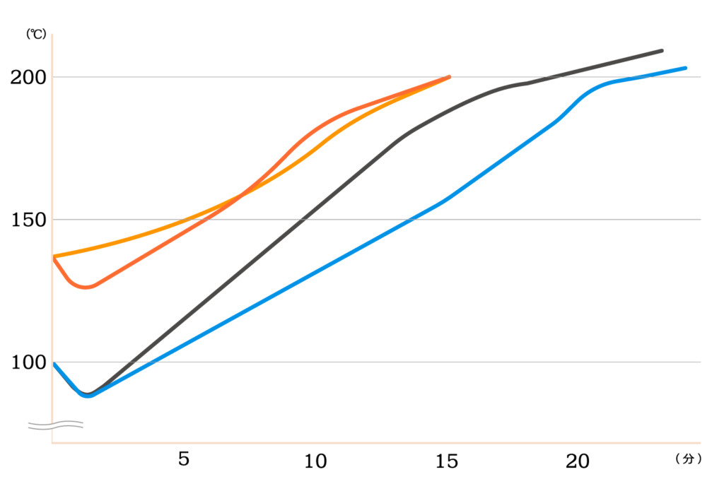 一般的な焙煎では、水分を「早く抜くべきもの」として扱います。強い火力で一気に水分を飛ばすと、釜内が乾燥し、豆表面の温度だけが急上昇します。内部にはまだ水分が残っているため、表面と内部の温度差が大きく開きます。