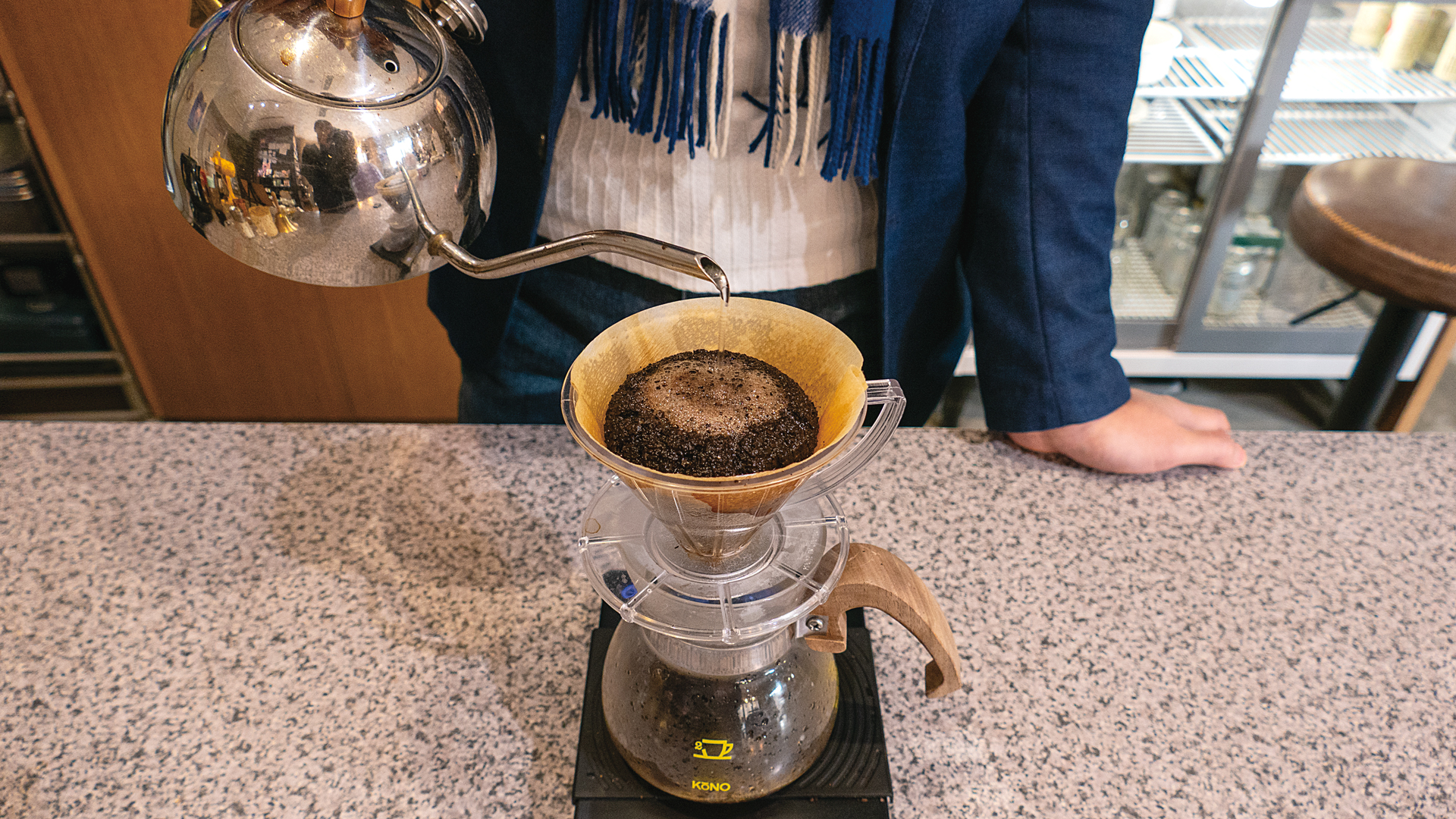 私たちのコーノ式かなざわ抽出法は違います。必要量の約1/3だけを粉から抽出し、甘みや香りが集中した「おいしい部分だけの濃縮液」を取り出します。残りはお湯で濃度を調整する。タンニンや渋みが溶け出す前に抽出を止めるので、ノイズがそもそもカップに入りません。